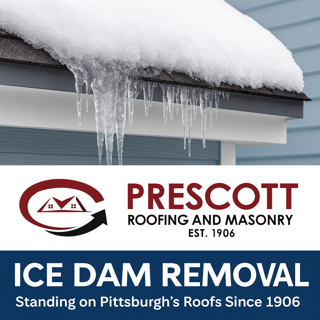 When Pittsburgh’s winter weather turns brutal, even the best-built roofs can face one of their biggest threats, ice dams. These walls of ice can cause serious damage long before you ever notice a leak. The house itself is often the primary source of heat transfer that impacts roof surface temperatures and ice dam formation. That’s why Prescott Roofing & Masonry, a name Pittsburghers have trusted since 1906, now offers a professional ice dam removal system.